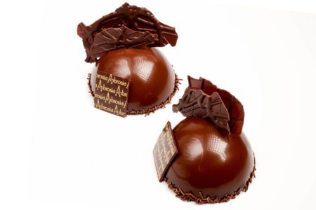 Bizcocho chocolate almendrado, crocante de nibs de cacao, núcleo de bavaroise de vainilla natural, mousse chocolate al 58%.