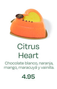 Masa azucarada de coco, mousse de chocolate blanco y maracuyá, núcleo de maracuyá y mango, glaseado de maracuyá y roca de coco.